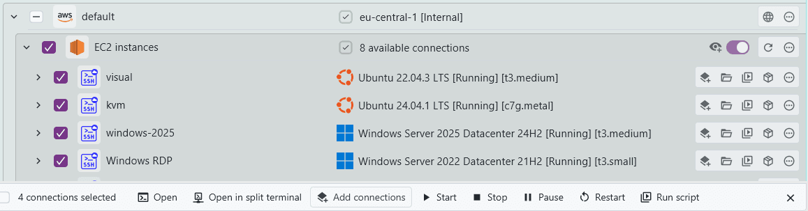 Any integrations that require a license are still shown in the list, but are denoted as requiring a license. You can add these connections and interact with them somewhat without a license. Only certain actions like opening a terminal session are not supported. That way, you are able to verify whether everything is detected correctly and works before considering upgrading to a paid plan.