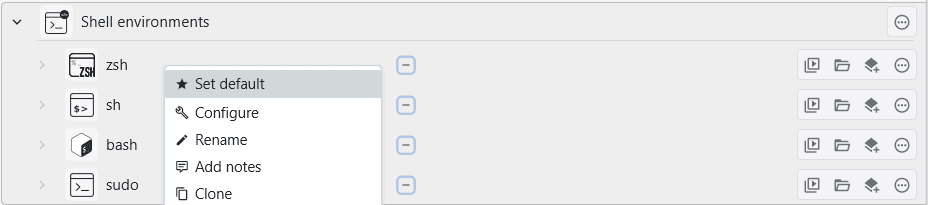 To always use a shell environment for a system which is not the default login shell, you can set a certain environment to be the default within XPipe. If this is done, the selected environment is always used when launching the main connection, there is no need to explicitly launch the shell environment.