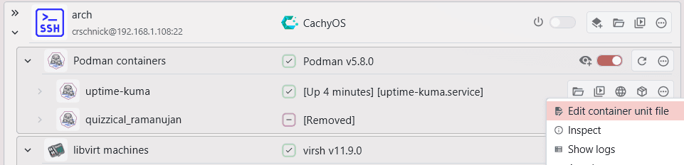 The podman integration supports quadlets, which are essentially a way to manage containers declaratively using systemd. Any container that is associated with a systemd service will show the unit file name and a button to edit this file: