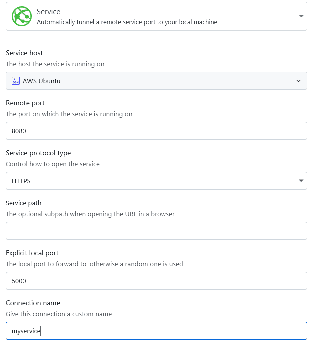 The second optional property is the service type. This one controls how the service should be treated and opened. If this is set to unknown, only the tunnel will be established. If it is set to HTTP/HTTPS, a browser will automatically open the service at the location. This location can also include an additional URL path if you don't want to open the root path /.