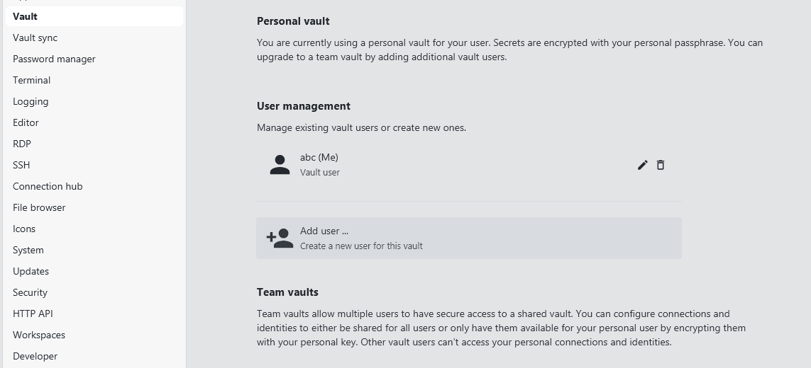 To start off, each team member first has to sync to the same git repository. You can then configure the vault users in the Vault settings menu. Each vault user requires a passphrase to be set which will be used to encrypt personal secrets in the vault. With a passphrase, other users won't be able to decrypt any connections and identities marked as personal.