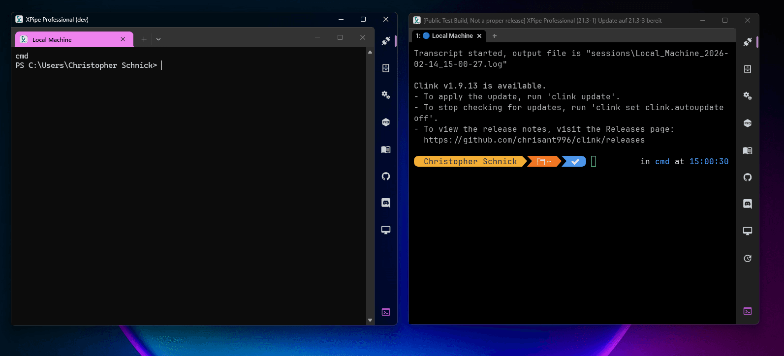 In this example, you can see that the left XPipe window has focus, so it will receive any input. The right XPipe window does not have focus as the window frame is greyed out, meaning that the terminal will receive input: