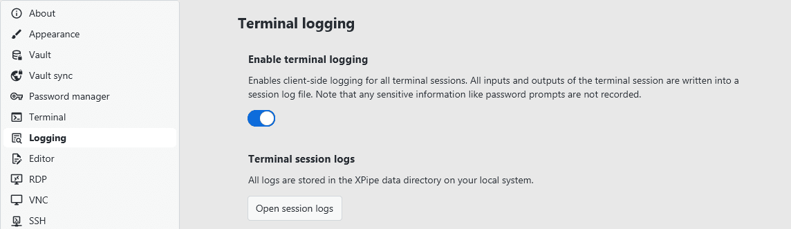 To keep track of past terminal sessions, you can enable terminal session logging in the settings menu: