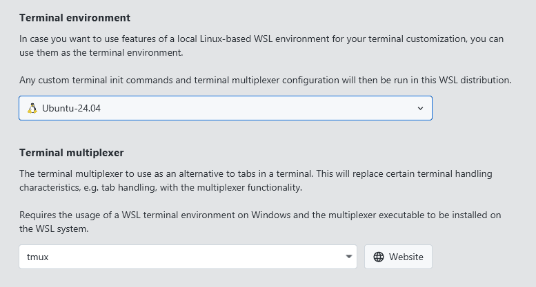 On Windows, most terminal multiplexers are not supported by default as they are designed to work on Linux systems. To work around this limitation, you can select a Linux-based terminal environment in the settings menu that is used to run the multiplexer instead. This terminal environment must be a WSL distribution installed on your local machine if you want to use multiplexers on Windows.