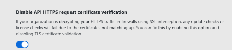 If your organization is decrypting TLS traffic to monitor it, you have the option to disable certificate checking for API calls in XPipe. You can find this option in the security settings menu: